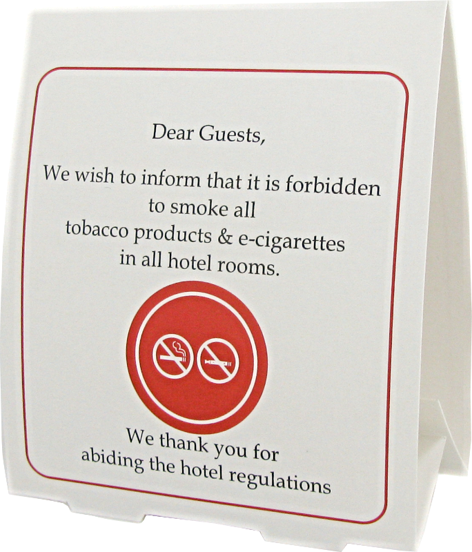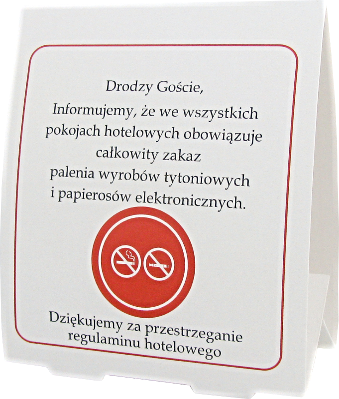 Kartonowy składany, dwustronny informator, mówiący o zakazie palenia w pokojach hotelowych. Informacje w 2 językach.